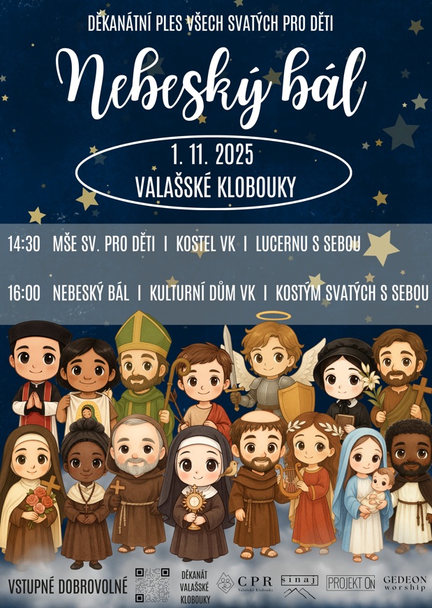 - V sobotu 1. listopadu na slavnost Všech svatých, zveme všechny děti a rodiny do Valašských Klobouk na NEBESKÝ BÁL! Začneme ve 14:30 dětskou mší svatou – můžete přijít už v kostýmu svého oblíbeného světce a s lucernou. Po mši svaté se společně vydáme průvodem do kulturního domu na Nebeský bál plný hudby, tance, her a radosti. Akci pořádají rodinná společenství valašskoklobuckého děkanátu ve spolupráci s Centrem pro rodinu. Informace ZDE, na webu CPR a na sociální sítích.
