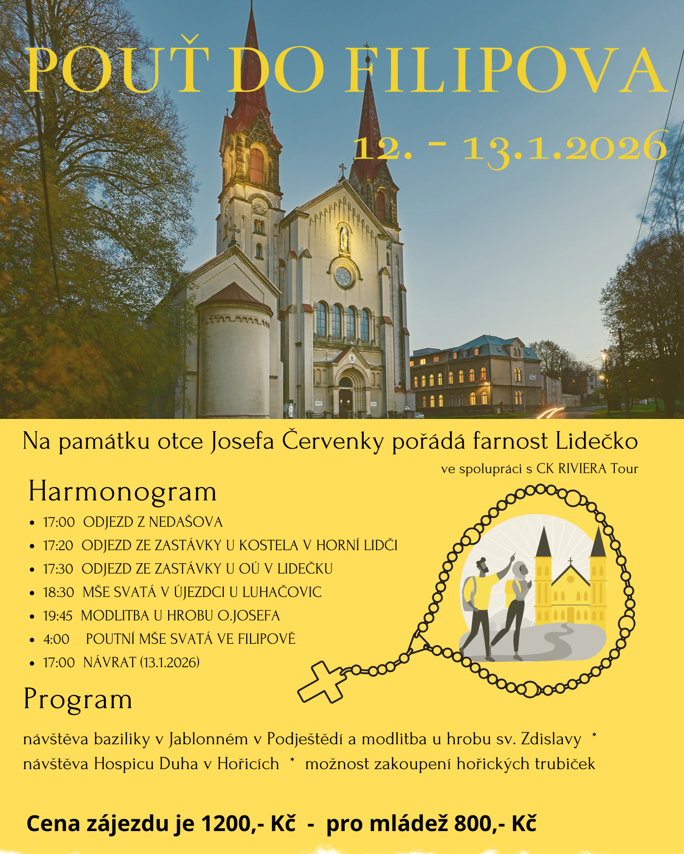 - Farnost Lidečko oznamuje, že pořádá 12.-13. ledna 2026 (z pondělí na úterý) pouť do Filipova. Rezervují v autobuse několik míst pro poutníky z naší farnosti, jako už minulé roky. Kdo by měl zájem o tuto pouť, ať to nahlásí v zákristii do Vánočních Svatků, z důvodu omezené kapacit míst. Cena je 1200 kč, odjezd v pondělí v 17:00 hod. ze zastávky u Ivanka a návrat v úterý navečer. Bližší informace najdete ZDE.