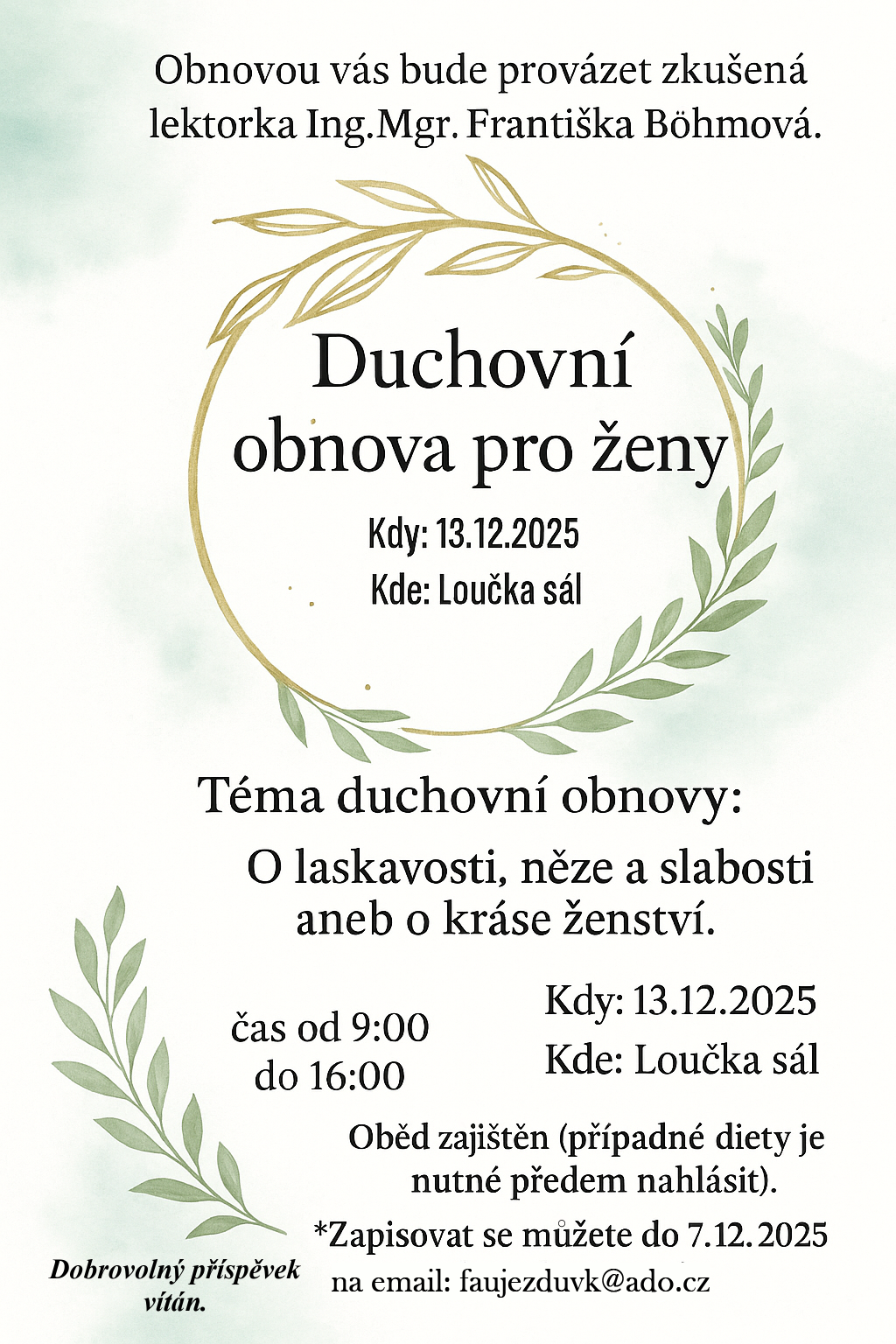 - Farnost Újezd zve na duchovní obnovu pro ženy, která se koná 13.12.2025 od 9.00 hod. v Loučce v obecním sále. Obnovu vede Františka Böhmová. Informace najdete ZDE.